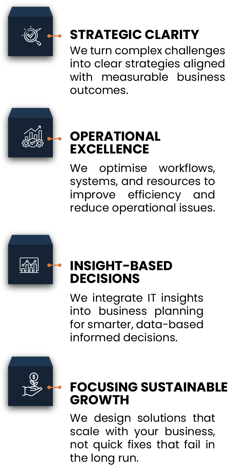 We help businesses overcome fragmented operations, unclear strategy, inefficient processes, legacy systems, and poor data visibility. Many clients struggle with scaling operations, aligning investments with business priorities, or responding to market changes quickly. We identify root causes rather than visible issues and resolve them.