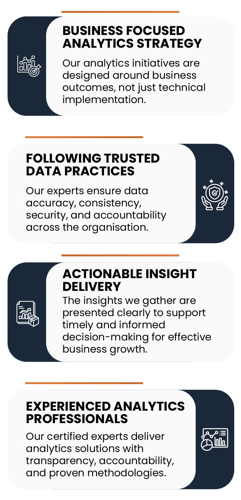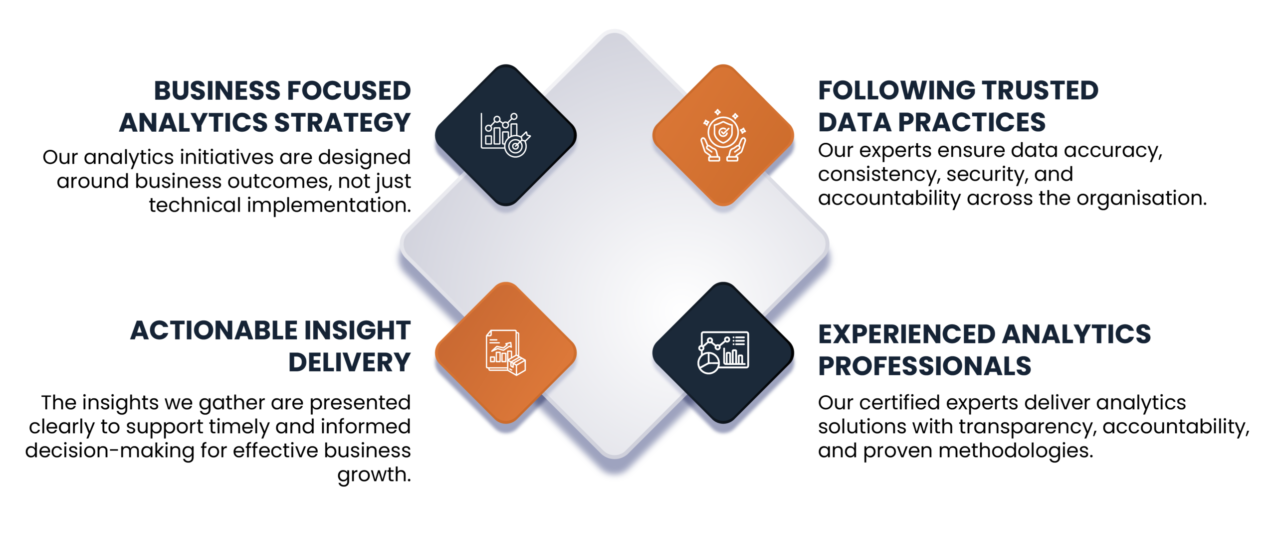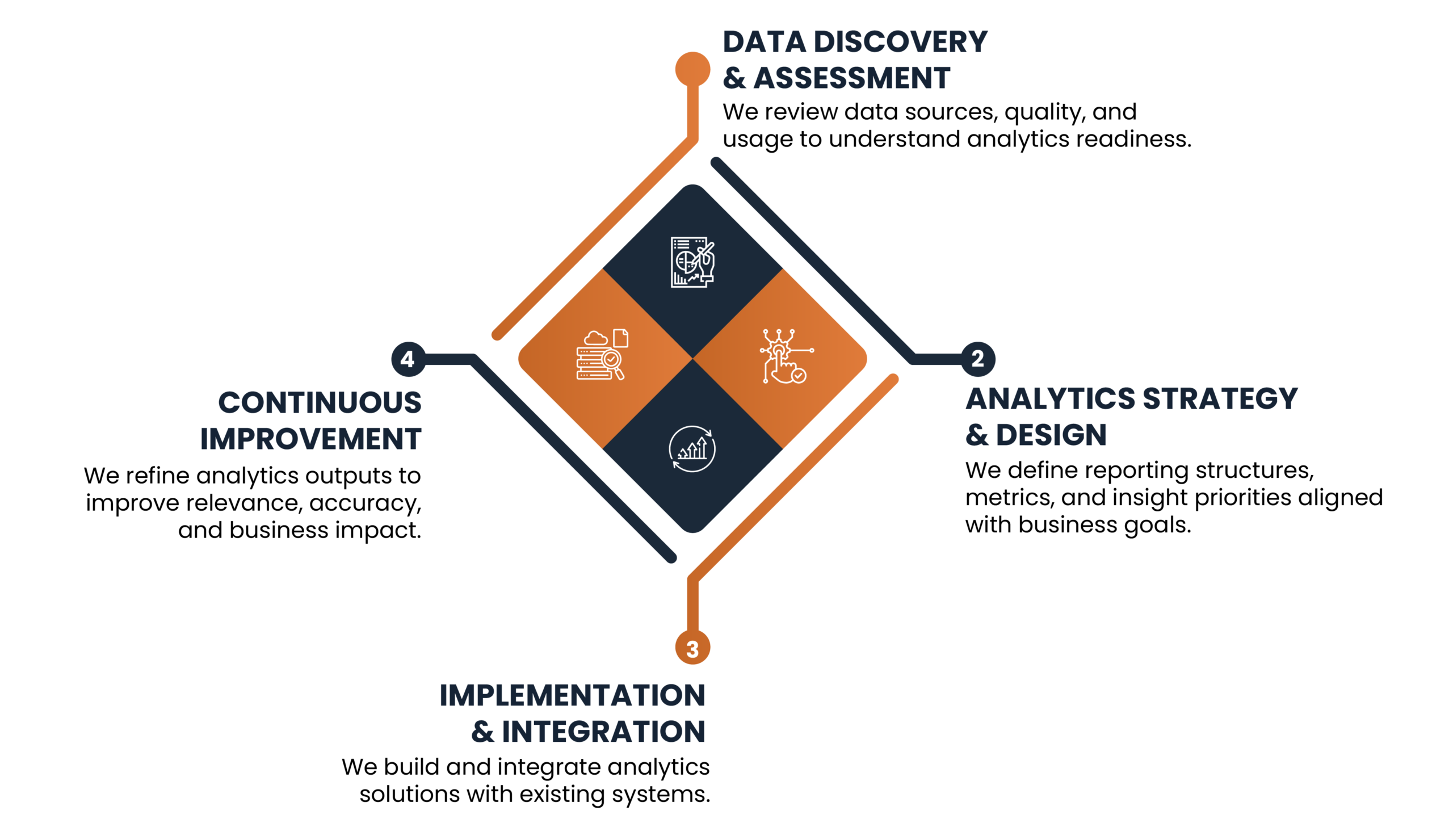 Whether it’s about management or implementation of a plan, we focus on offering clarity, accuracy, and usability. By aligning analytics with your business objectives, we help you improve performance, manage risk factors, and make better decisions based on reliable data. We make a difference via: