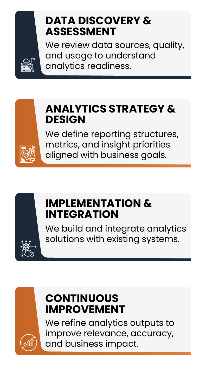 Based on this, we design an analytics roadmap covering integration, reporting, and insight delivery. The implementation of these insights follows a phased approach to ensure accuracy and adoption. We also offer ongoing refinement to make sure analytics continues to support changing business needs and delivers lasting results. Here’s how we do it: